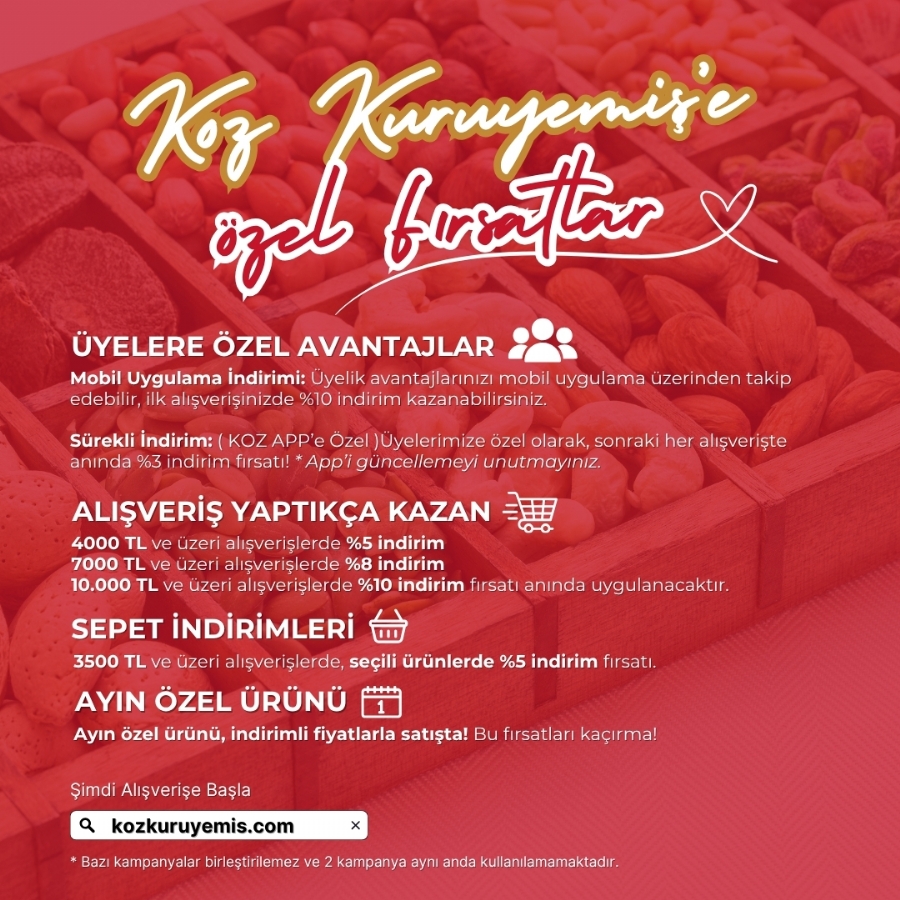 1974 yılında kuruyemiş sektörüne giriş yapan Koz´un ilk şubesi Er Kardeşler Kuruyemiş olarak Osmanbey bölgesinde açılmış ve kurulduğu günden bugüne dek şubelerini arttırmıştır. Kadıköy Koz Kuruyemiş olarak uzun yıllardan bu yana ürünlerimizi yakın bölgedeki müşteri portföyümüze ulaştırmaktaydık 2020 senesi itibari ile online kuruyemiş siparişi taleplerini karşılamak adına web sitemizi açtık ve Türkiye´nin her yerine muhteşem ürünlerimizi ulaştırmaya başladık. Sizlerde online olarak kuruyemiş siparişi vererek lezzetlerimizin tadına bakabilir ve kuruyemiş ürünlerinin eşsiz faydalarından yararlanabilirsiniz.