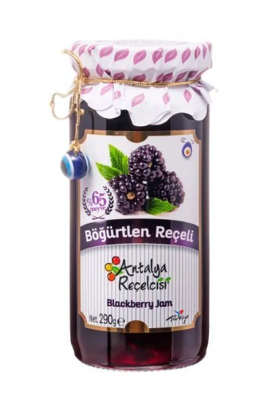 290 gram ağırlığındaki Böğürtlen Reçeli, cam kavanozunda tüketiciye sunulmaktadır. Böğürtlen Reçeli %65 meyve içerir. Özenle seçilmiş meyvelerden üretilen reçel, şeker, meyve suyu ve limon suyu eklenerek yapılmıştır. Katkı maddesi içermeyen ev tipi reçeli tüketirken meyve aromasını tam lezzetiyle alabilirsiniz. Antalya reçelleri, meyve ve sebzelerin tam olgunluk zamanında toplanarak işlenmesi sonucu elde edilmektedir. Tüm ürünler vakumlu kazanlarda ve 60 dereceyi aşmayan ısıda pişirilerek; renk, tat ve aromada maksimum oranda koruma sağlanmaktadır. Böylece renk daha açık ve canlı; tat ve aroma ise meyve ile neredeyse aynıdır.