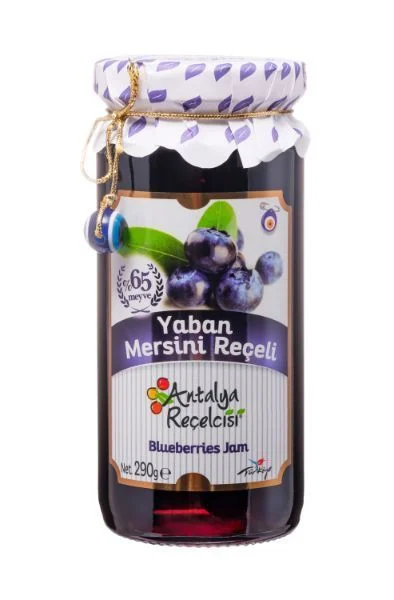 290 gram ağırlığındaki Yaban Mersini Reçeli, cam kavanozunda tüketiciye sunulmaktadır. Yaban Mersini Reçeli %65 meyve içerir. Özenle seçilmiş meyvelerden üretilen reçel, şeker, meyve suyu ve limon suyu eklenerek yapılmıştır. Katkı maddesi içermeyen ev tipi reçeli tüketirken meyve aromasını tam lezzetiyle alabilirsiniz. Antalya reçelleri, meyve ve sebzelerin tam olgunluk zamanında toplanarak işlenmesi sonucu elde edilmektedir. Tüm ürünler vakumlu kazanlarda ve 60 dereceyi aşmayan ısıda pişirilerek; renk, tat ve aromada maksimum oranda koruma sağlanmaktadır. Böylece renk daha açık ve canlı; tat ve aroma ise meyve ile neredeyse aynıdır.